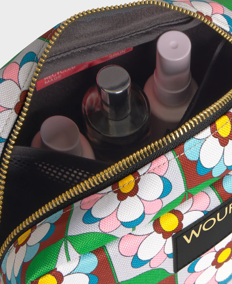 The Kaleido toiletry bag, made from 100% recycled fabrics, is ideal for carrying cosmetics, makeup, and toiletries. It features a water-repellent finish and has one main compartment and one inside pocket, perfect for organizing and carrying essential toiletry items.