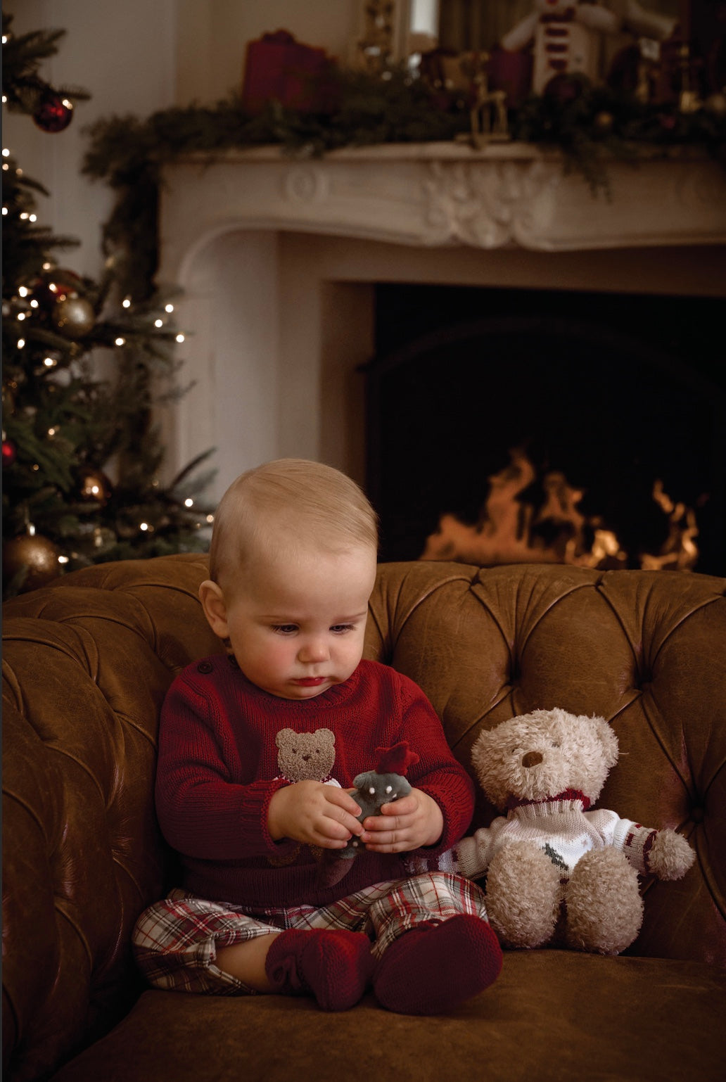 Timeless holiday charm with a cozy, playful twist. This festive set features a classic knit sweater adorned with a soft chenille bear patch, paired with traditional winter tartan pants. A heritage-inspired look made for fireside photos, family gatherings, and baby's first holiday season.