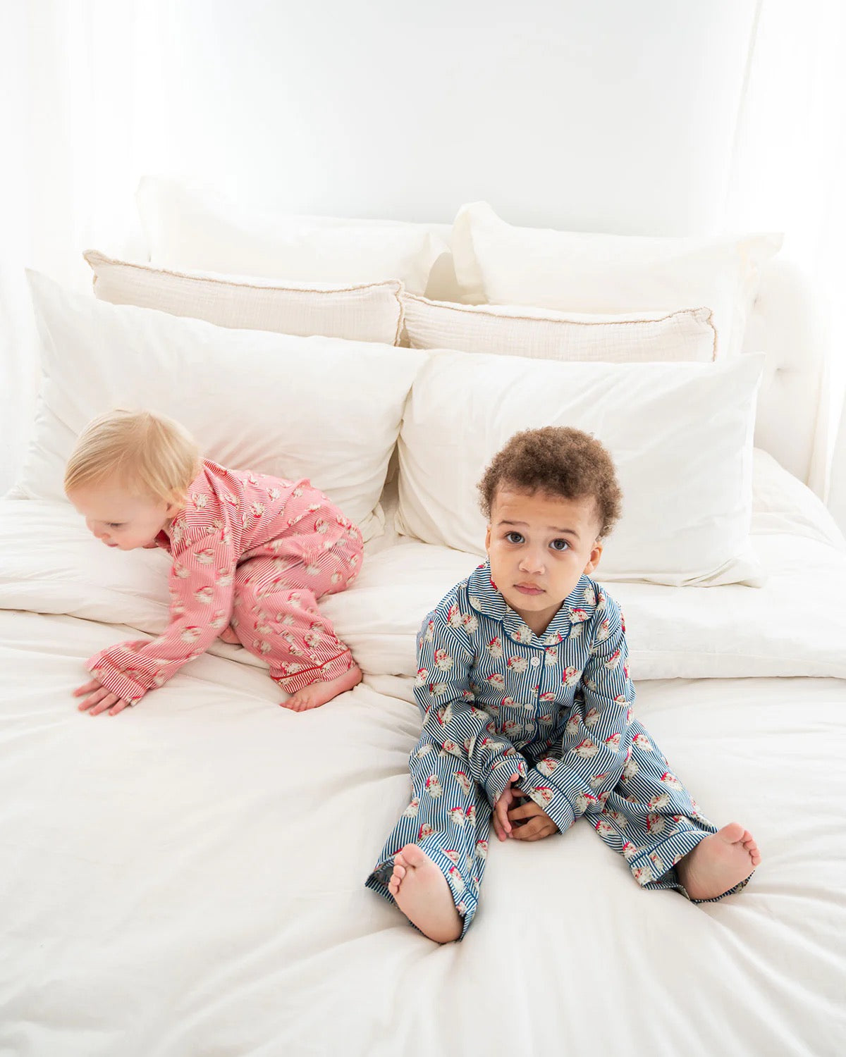 Make the holidays extra special with our new and improved Navy Striped Vintage Santa Pajama Set! Featuring a charming retro Santa print with festive stripes, this cozy pajama set is designed for comfort. Made with our new sizing chart and modal cotton fabric to fit better and wrinkle less. The classic button-down top with contrast piping and matching elastic-waist pants make it perfect for family matching moments and Christmas Eve traditions.