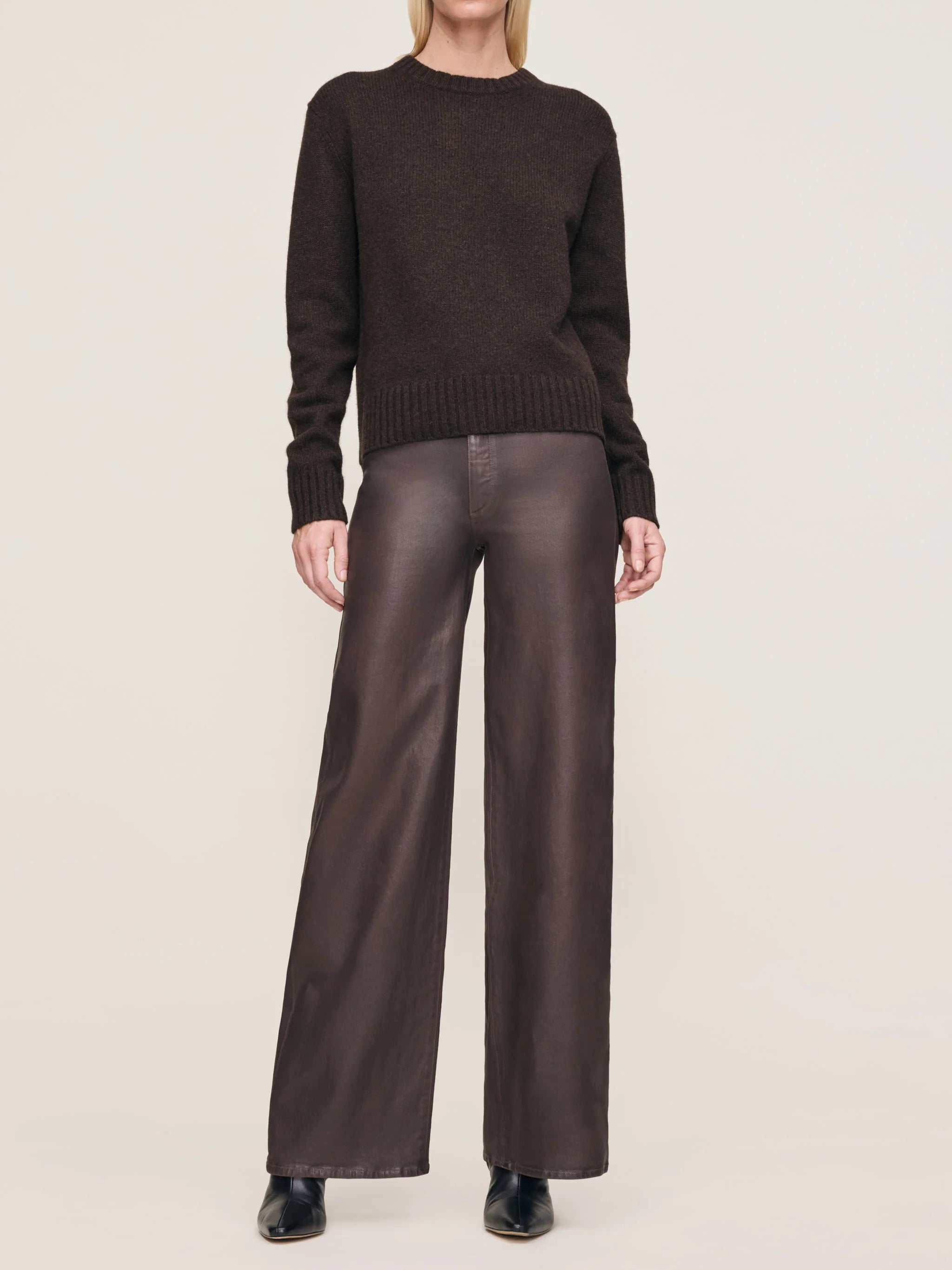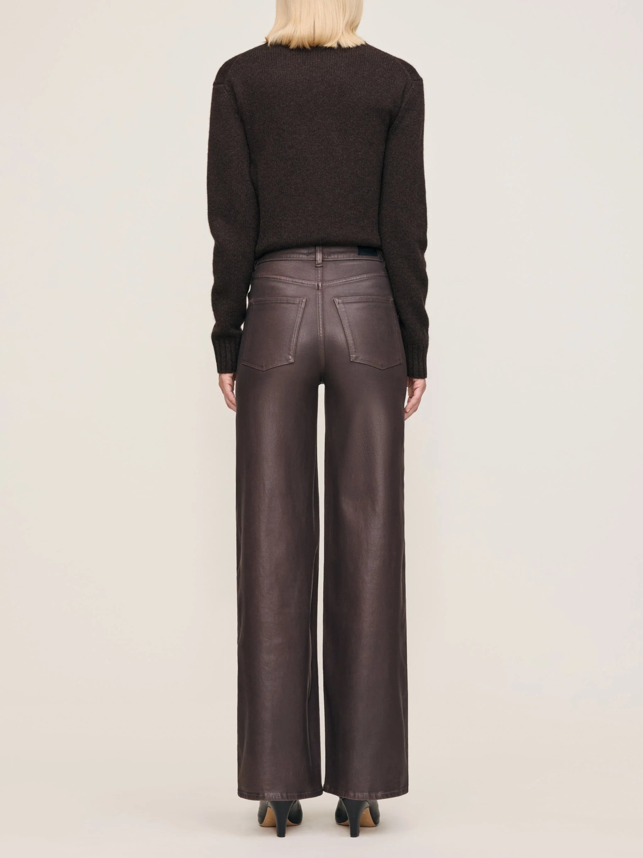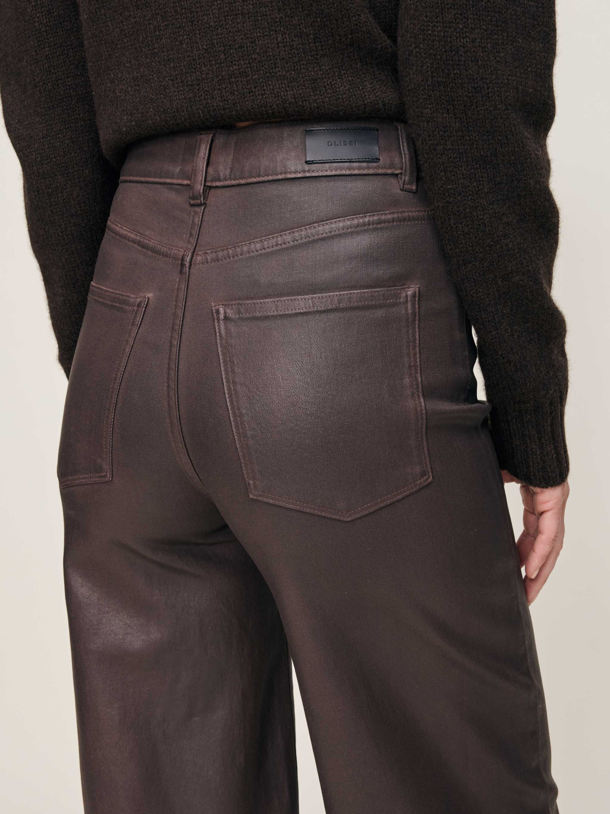 Walnut Coated is a warm, deep brown coated denim. It features black oxide hardware, tonal stitching, a clean hem and a black back patch.
