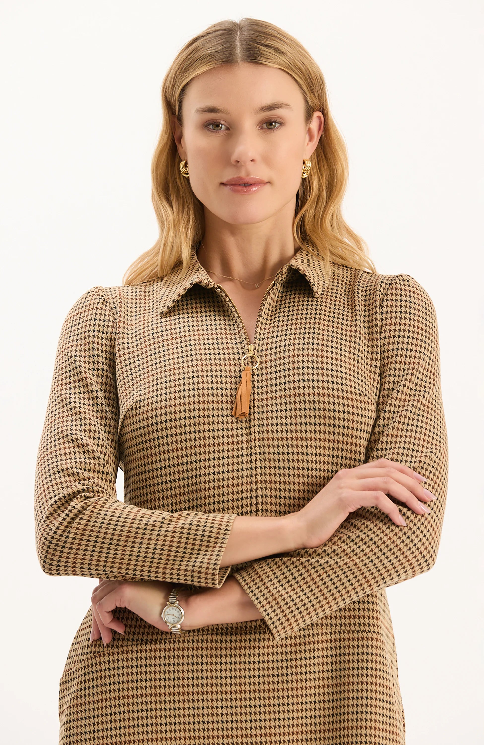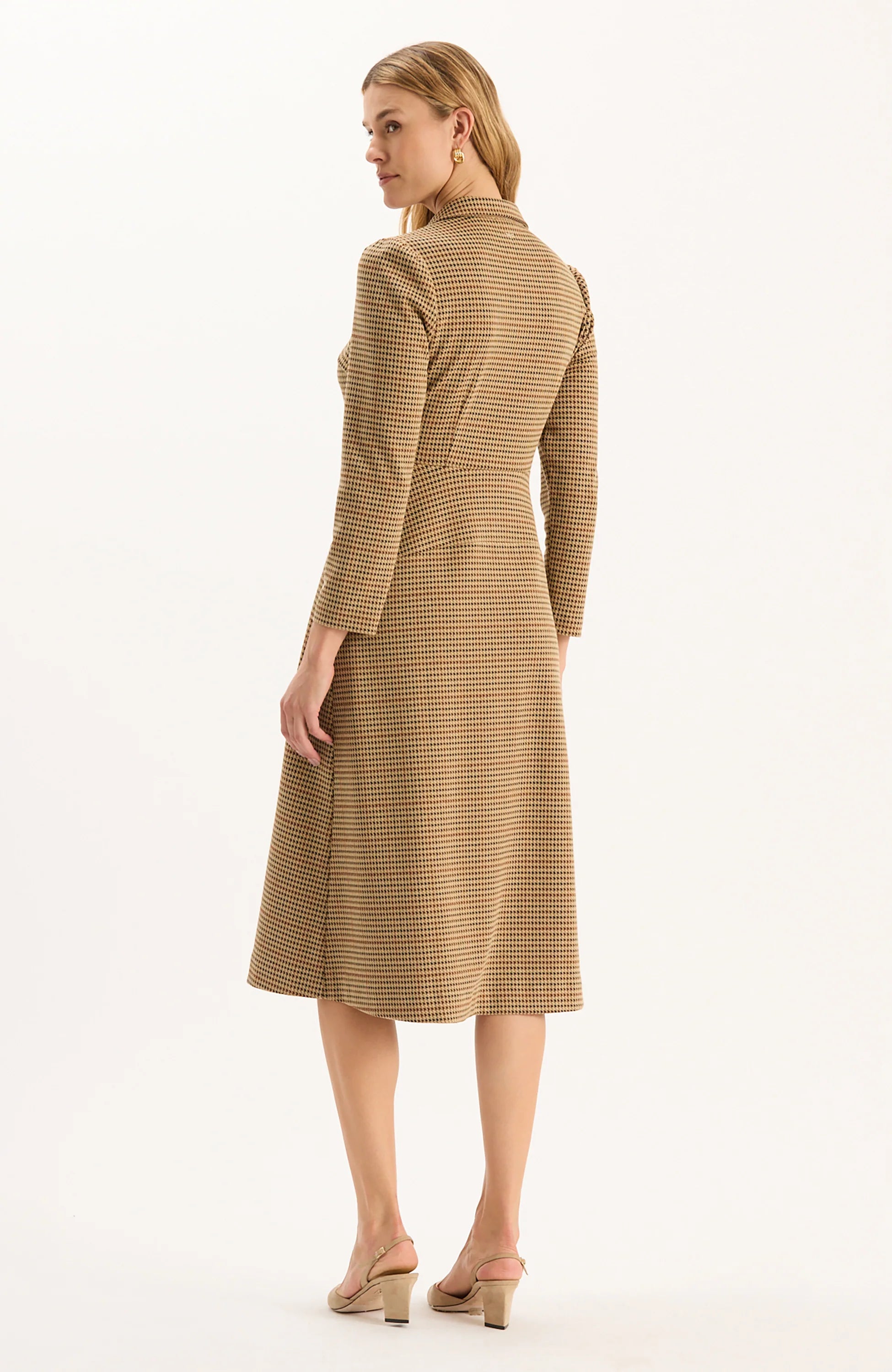 Introducing Ella, the newest addition to our Knit Girl Collection. Designed in our signature knit fabric, the Ella Dress feautures a timeless houndstooth pattern that will never go out of style. The silhouette has straight fit with a fluid skirt for subtle movement and shape, a collared zip neckline, and midi length that create a sleek and sophisticated look.
