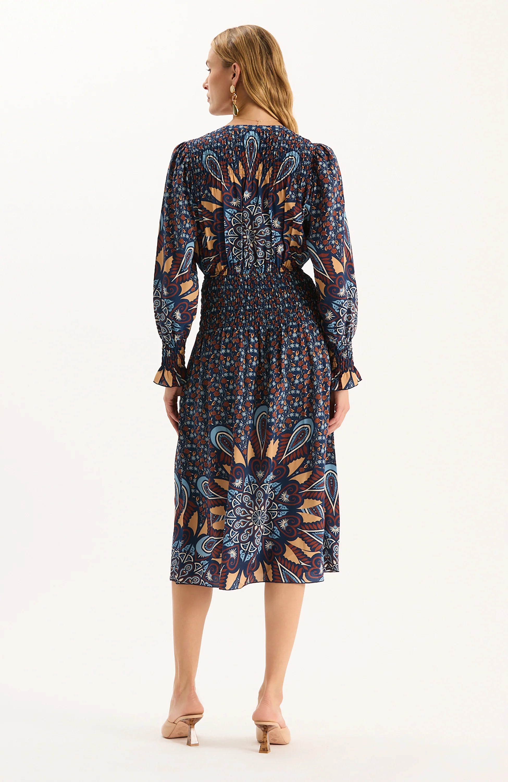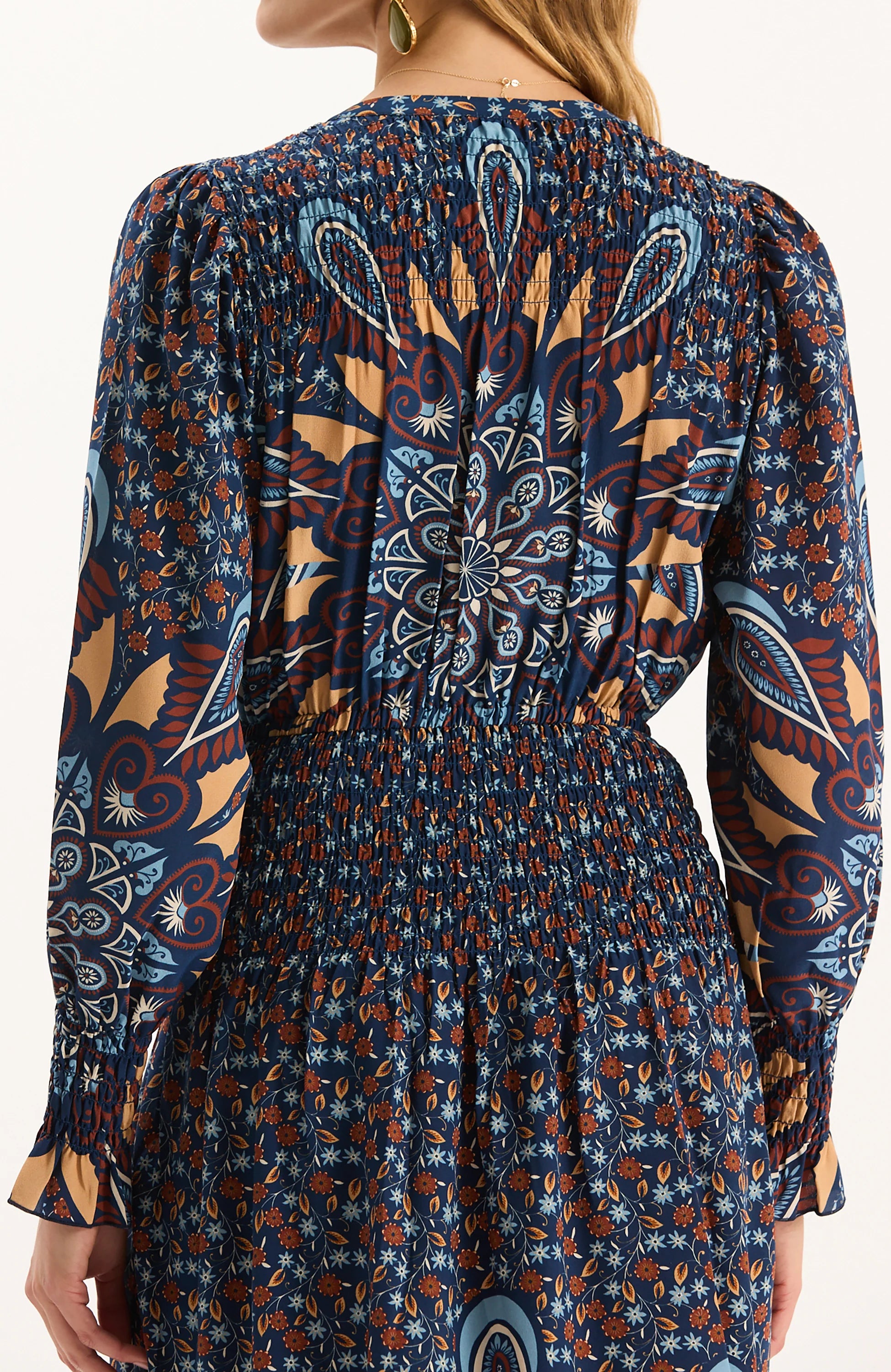 Made from 100% silk, the Posie Silk Sunflower Burst Dress is a statement piece that combines elegance with effortless wearability. Featuring a bold sunflower-inspired burst print, this dress is perfect for multiple occasions. The design includes a smocked waistline that flatters the figure while ensuring comfort, along with long sleeves finished with subtle ruffle cuffs for a feminine touch. The lightweight silk drapes beautifully, giving the skirt graceful movement with every step. A split neckline adds a modern detail, making it easy to dress up with heels and jewelry or wear more casually with flats.