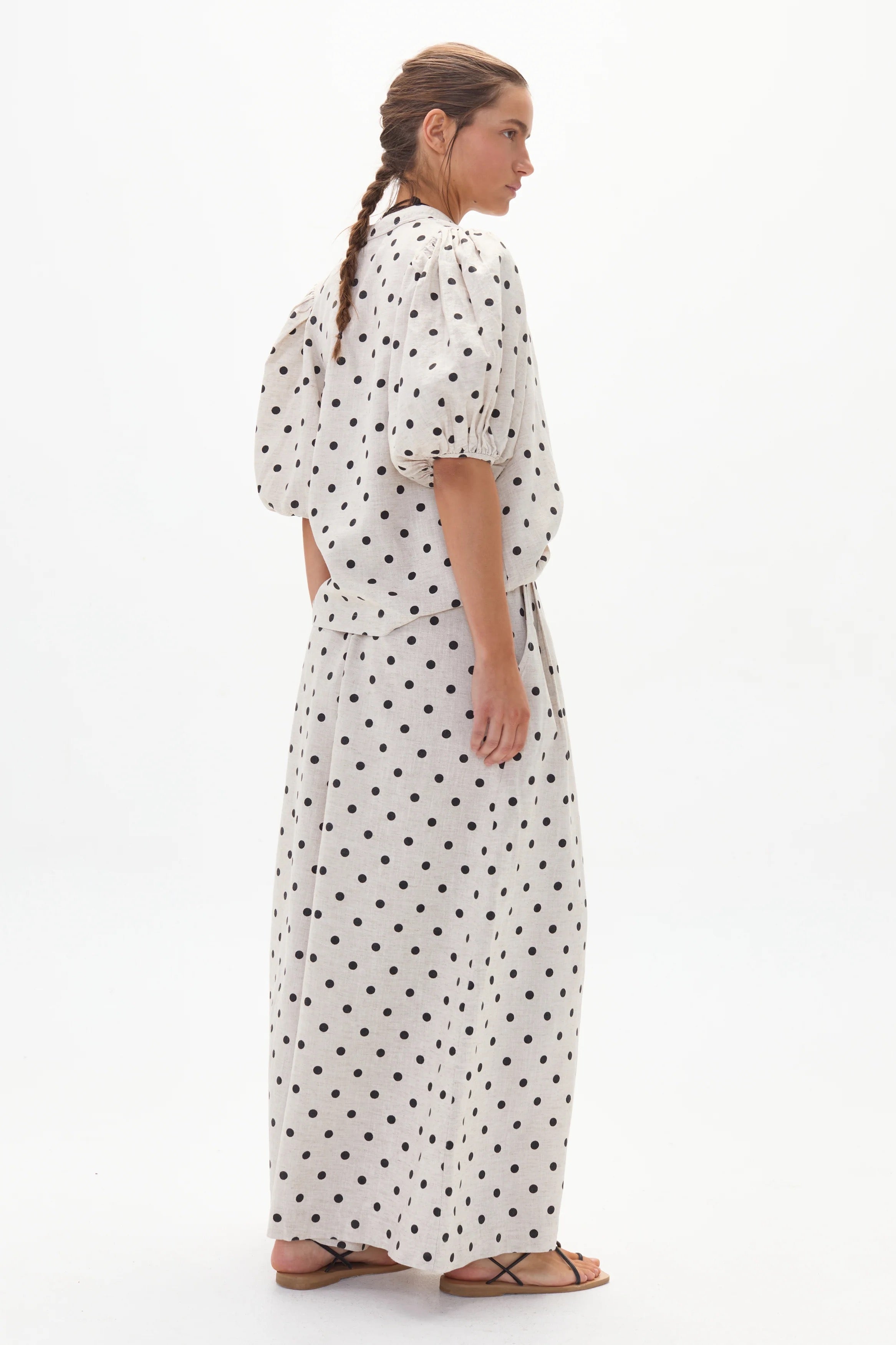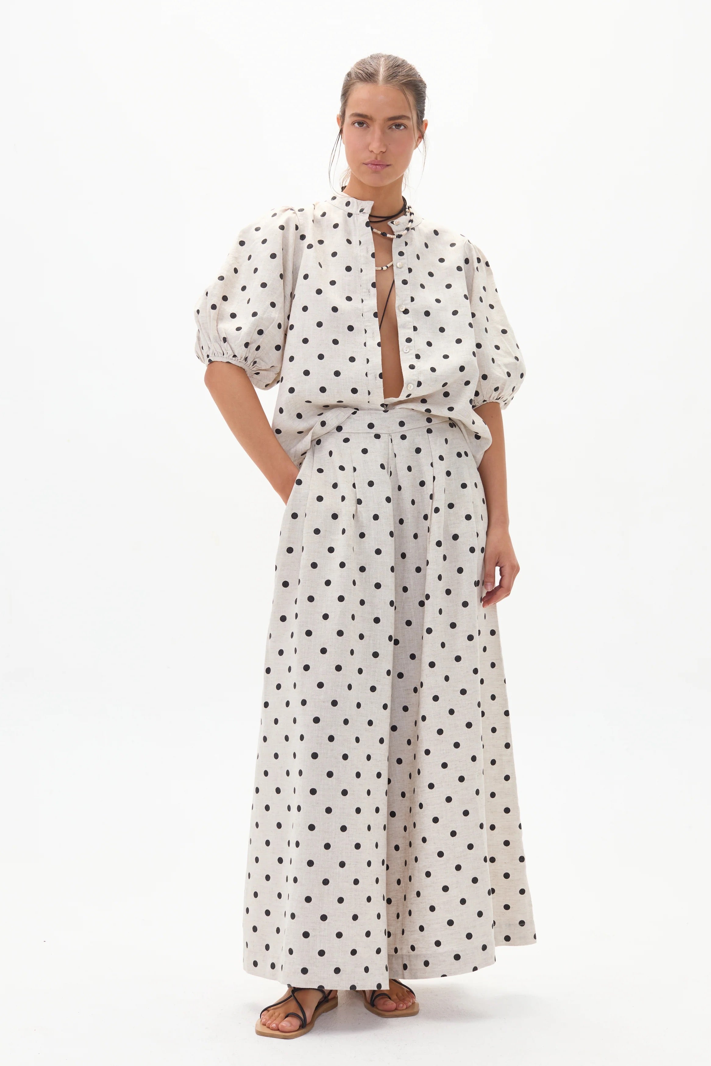 The Bubble linen top is a very feminine and flattering piece for any occasion. Features a mao neckline, button front closure, and puff sleeves. Paired it with the Culotte Pants, the Frida Shorts, or your favorite jeans.