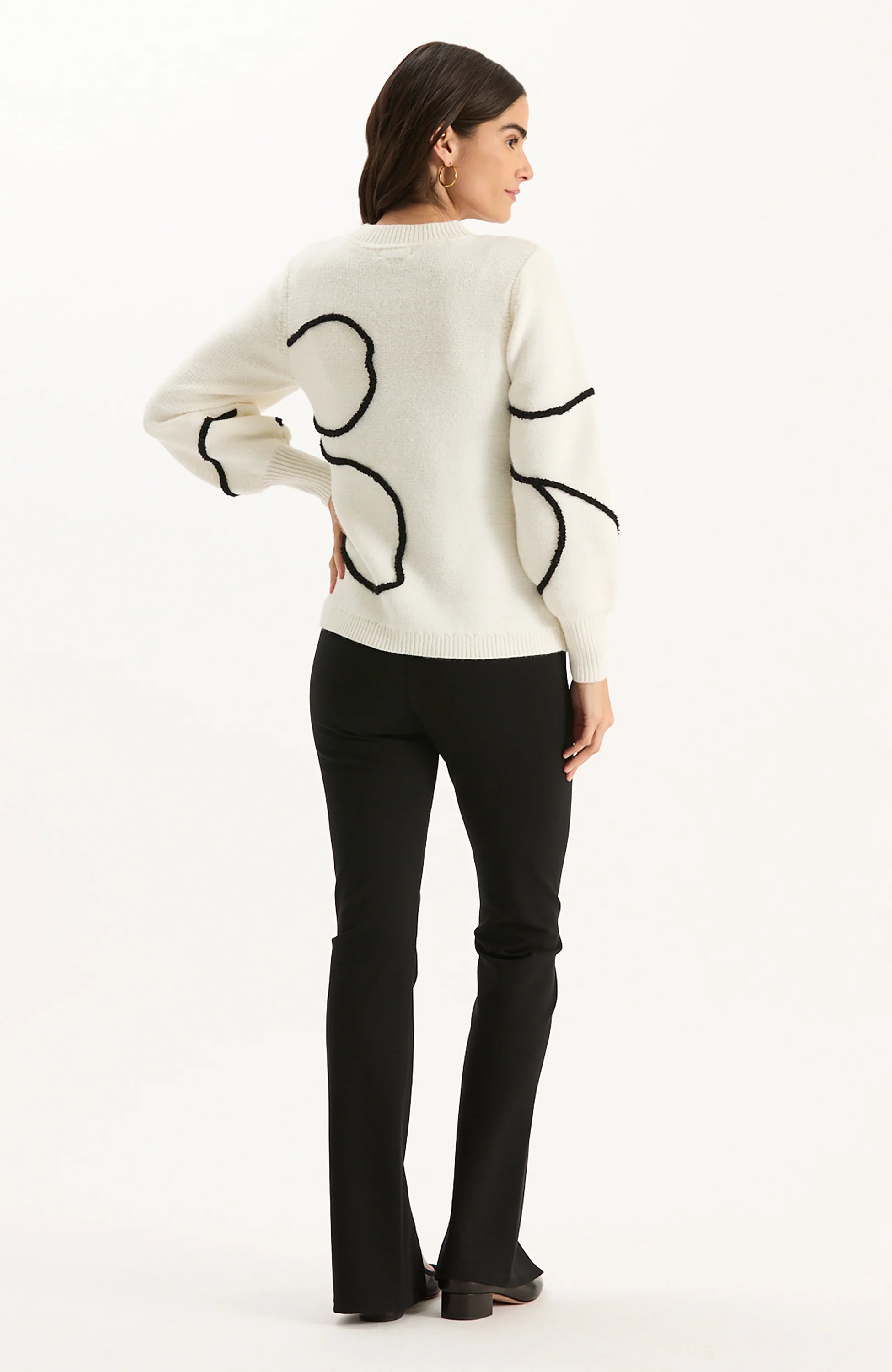 Cozy yet statement-making, the Millie Etched Mock Neck Sweater is a chic blend of comfort and contemporary style. Crafted from a soft, mid-weight knit, this sweater features an elegant ivory base adorned with an abstract black floral design. Pair it with denim for an elevated weekend look or tailored trousers for a more refined office look.