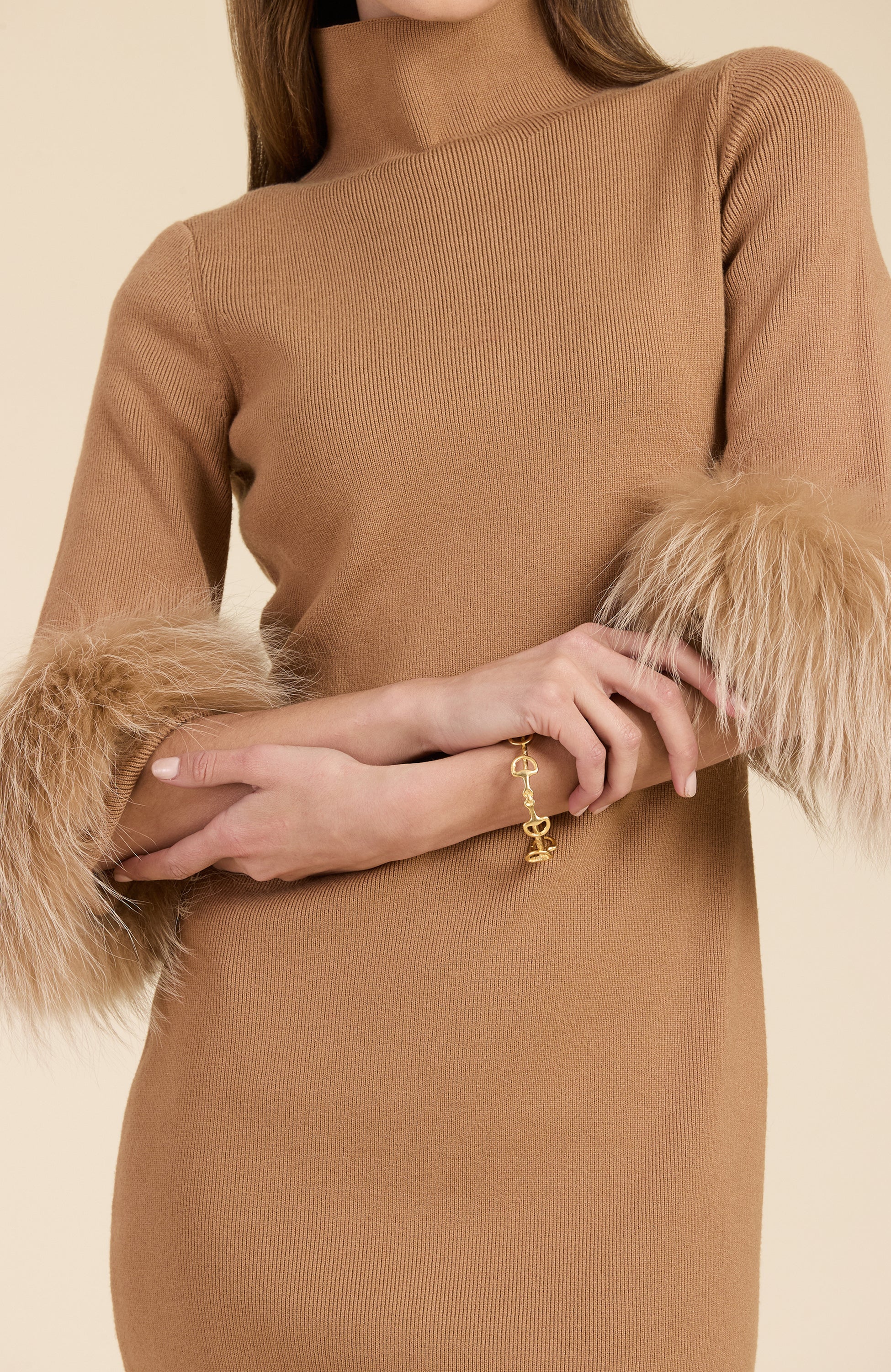 Sloane Fur Trimmed Knit Dress Camel