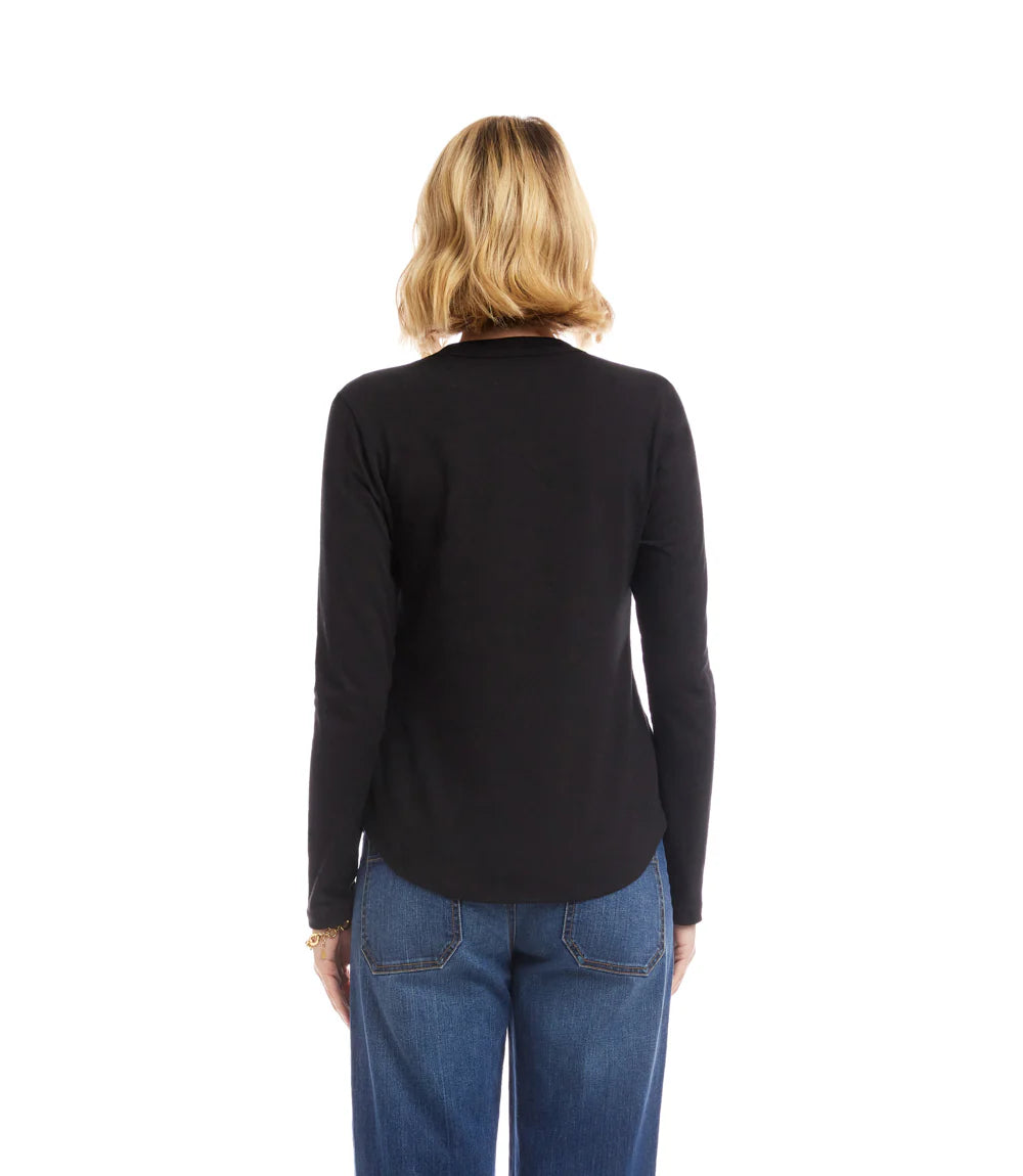 An elevated take on a wardrobe staple, this long sleeve top features a sparkling embellished bow at the neckline for a touch of feminine charm. Designed with a classic crew neck and an easy pull-on style, it offers both comfort and polish.