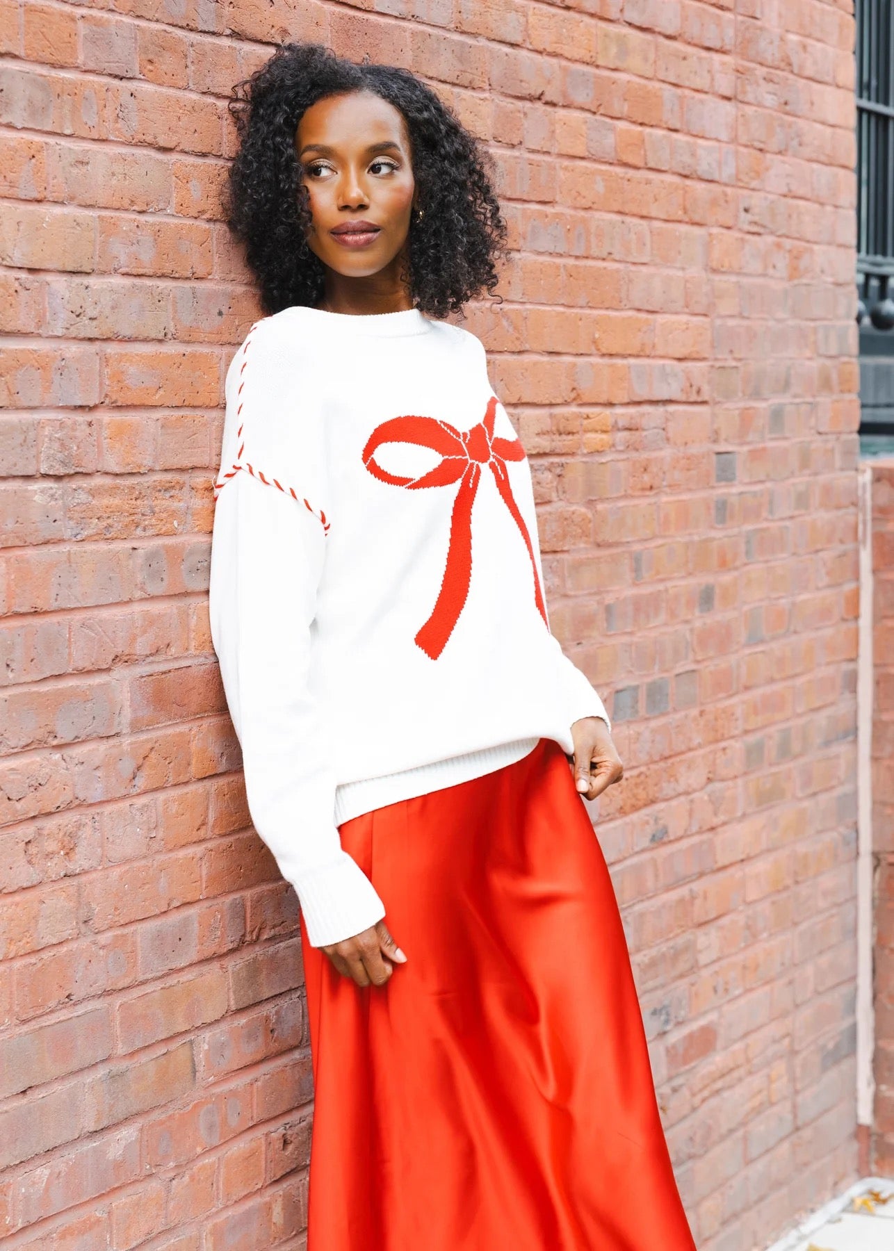 All tied up and ready to gift (even if that's to yourself!) The Riley crewneck sweater "Tied with a Bow" features a contrasting red bow and sleeve detail for a modern take on a sweet classic.