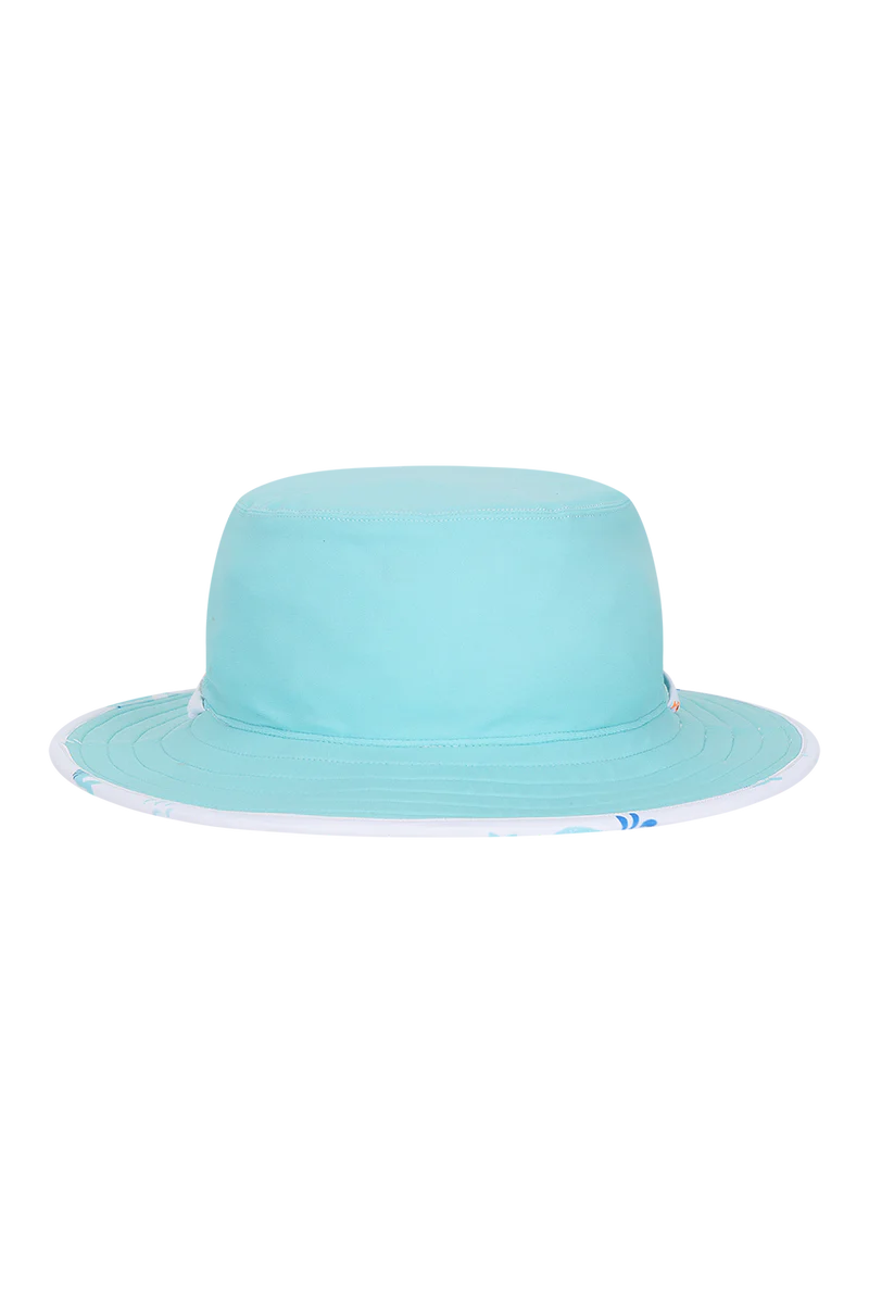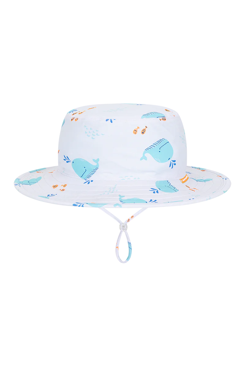 Featuring an exclusive underwater print packed with friendly whales and "pop" fluorescent fishies, this hat is a total standout for the pool or beach. Made from a premium, stretchy swim fabric, it’s designed for maximum comfort in the water and features a "magic" floatable brim so it won't sink to the bottom of the sea. With its adjustable back toggle and detachable chin strap, the Miekle stays snug and secure even during the biggest cannonballs!