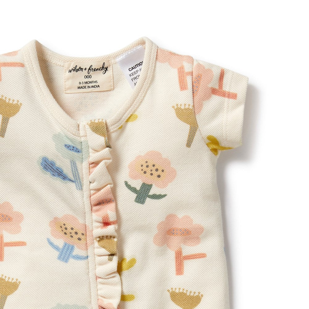 Introducing the Cookie Cut Organic Ruffle Zipsuit - the perfect choice for your little one's comfort and style. Made with organic cotton pique, this zipsuit features a charming all-over print, a convenient zip-through front, and short sleeves.