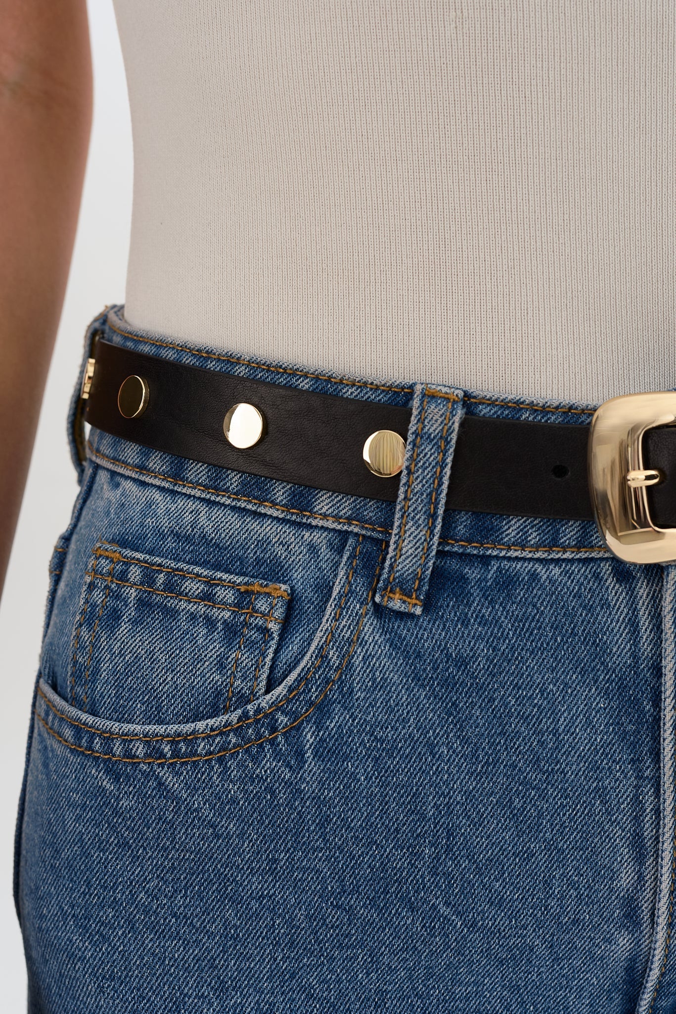 Refine your everyday styling with this studded leather belt, finished with a polished gold-tone buckle for a timeless yet modern accent. Designed to elevate denim and tailored silhouettes alike, it delivers understated structure and shine.