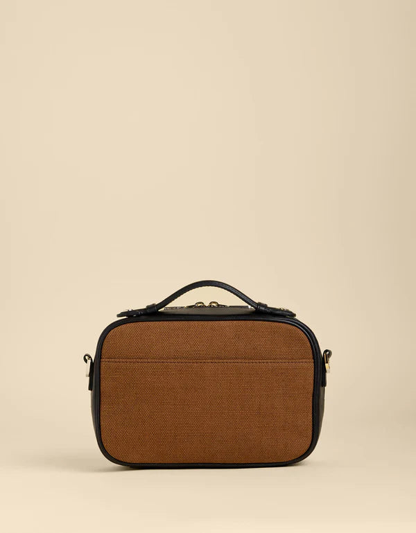 Made from a toffee-toned woven cotton jute with black leather accents, this neutral, wear-with-anything crossbody is built for daily ease. It features a front zip pocket, back slip pocket with button closure, and a top handle. Inside, a spacious interior with one slip and one sip pocket keeps all your essentials in place. The adjustable, removable strap offers versatile styling whether worn as a crossbody, or carried as a small satchel.
