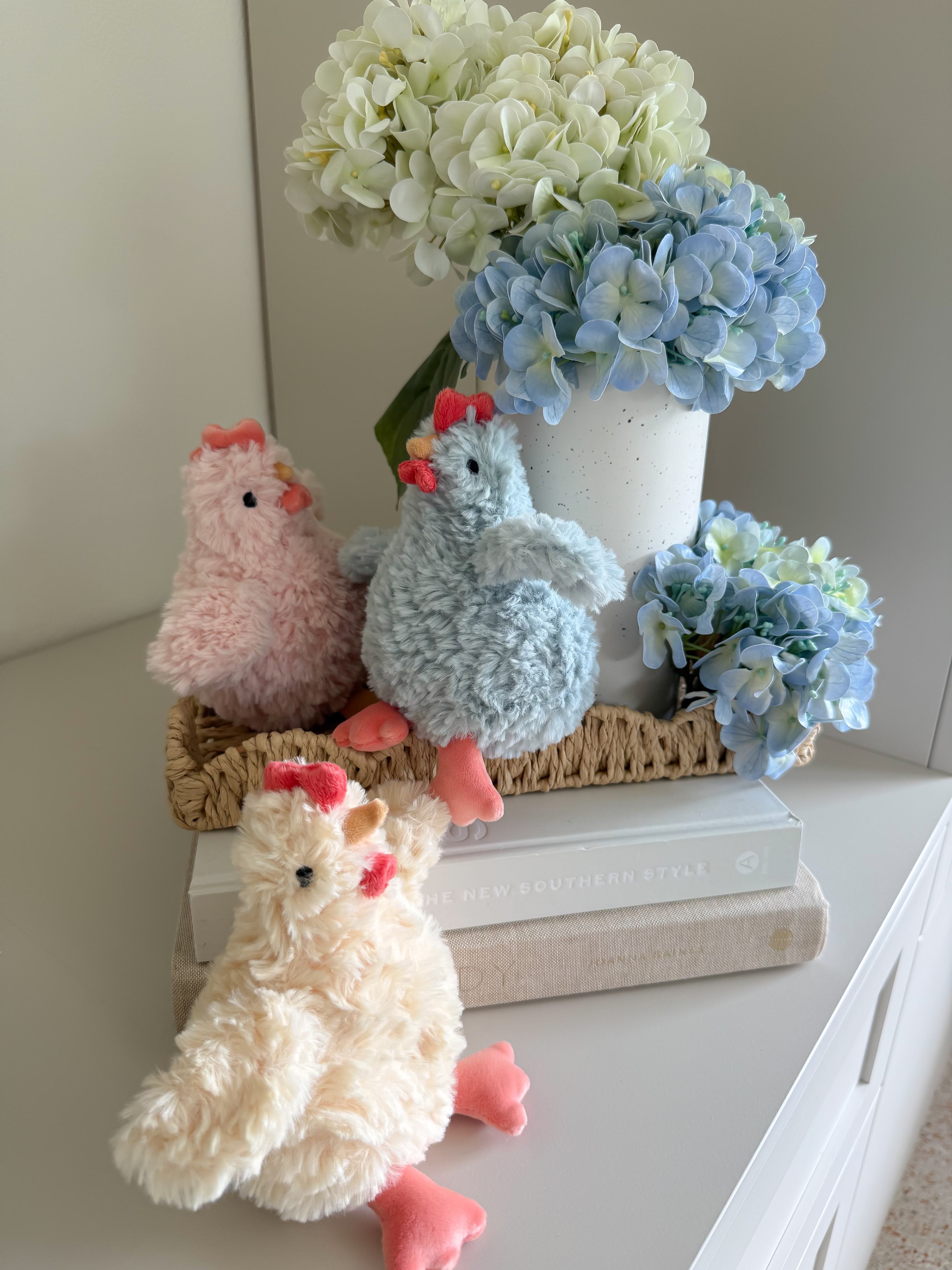 Bursting with light blue textured fluff, and a darling comb on top, she struts pure cheerful charm from beak to tail. More than just a pretty poulet, this fabulous feathered friend is crafted with love.