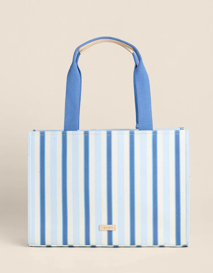 Our Shopper Tote is made of durable, cotton material, now in our popular Flagler resort wide blue and white stripe print. Throw the thick, cotton-webbed straps over your shoulder and head to the market or beach with your goodies stowed away in the roomy interior, 2 slip pockets, and a zipper pocket