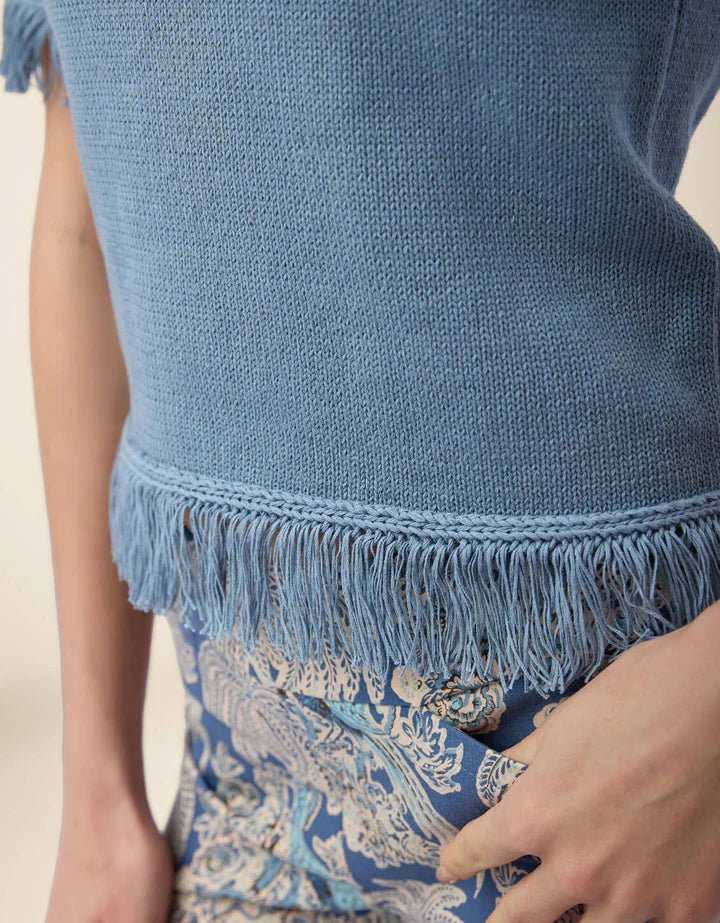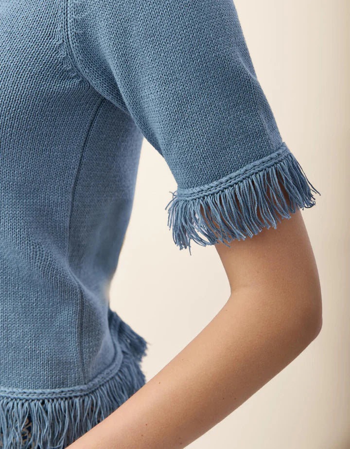 Made for transitional seasons, our cotton blend Sofia Fringe Sweater pairs well with bold prints in a harbour blue. The flirty fringe at the sleeve and bottom hem complements the sophisticated, luxurious look of the crewneck and short, elbow length sleeves.