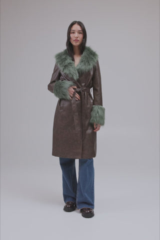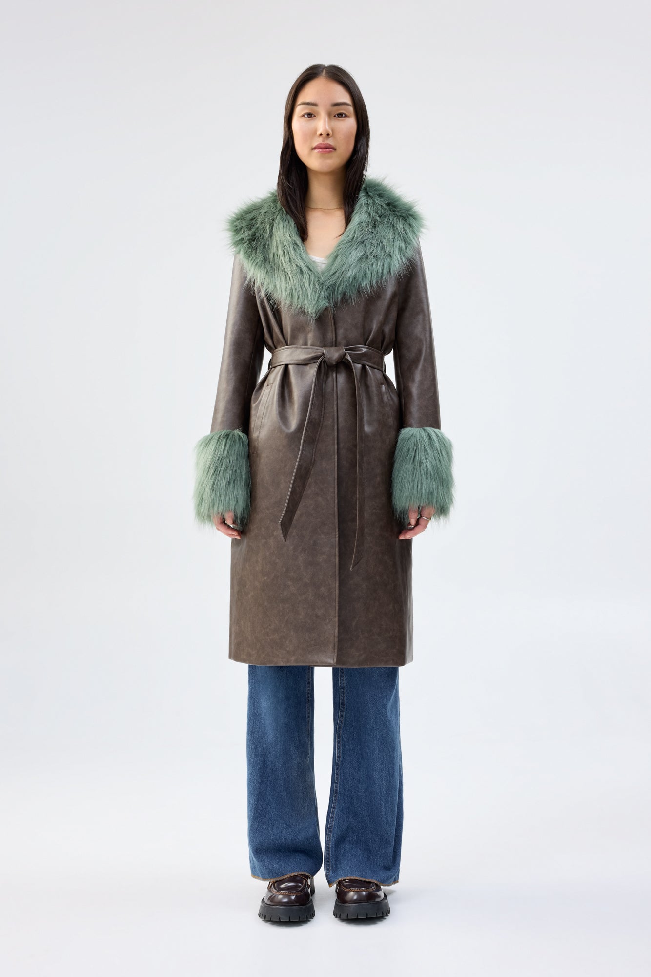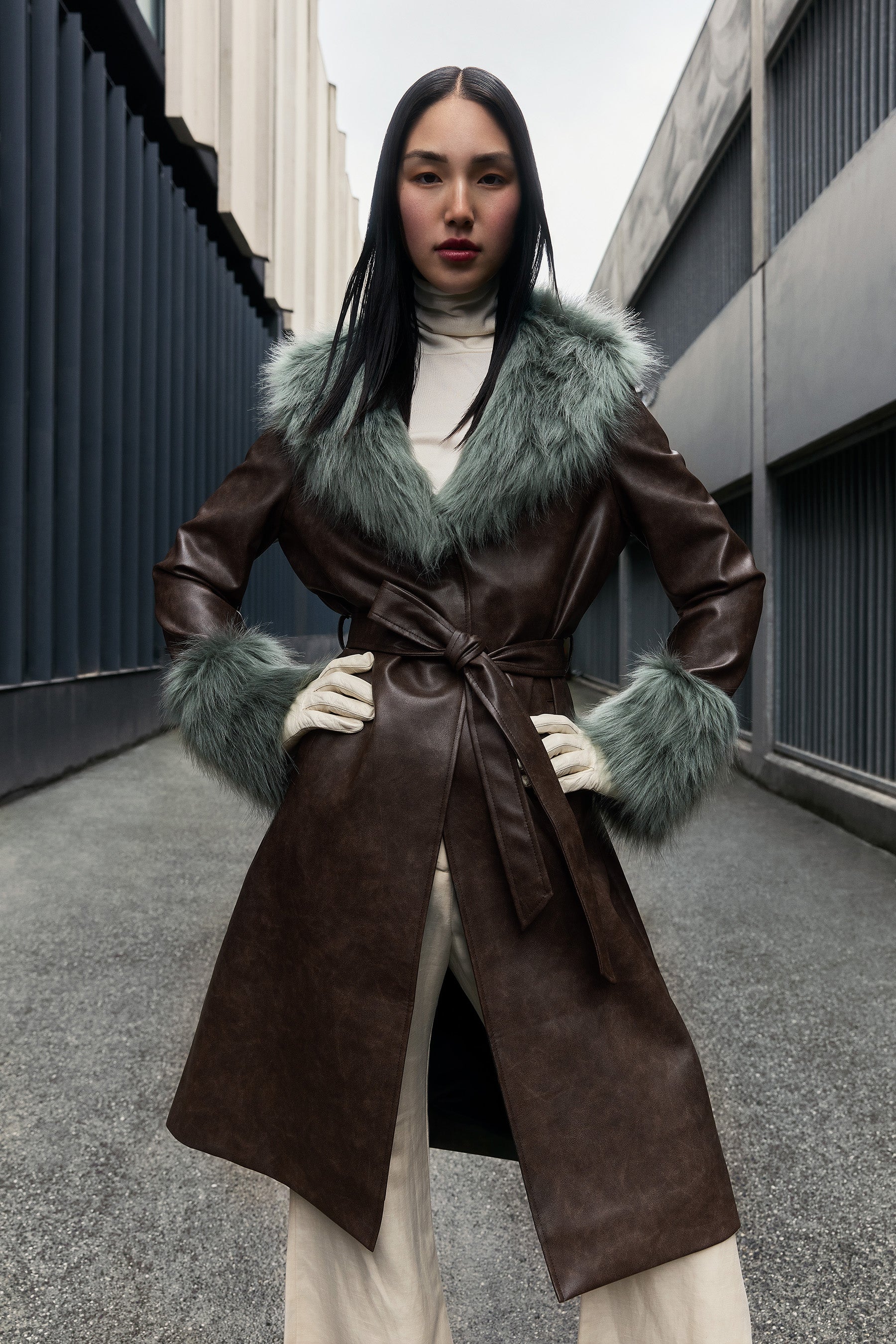 The Empathy Coat balances soft structure with tactile luxury. A PU-belted waist