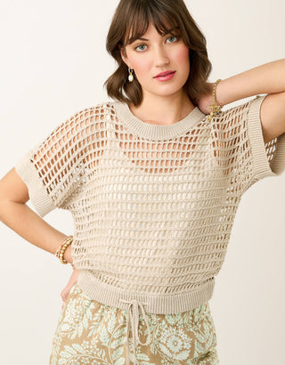Woman wearing a blue sweater with floral embroidery in a rustic setting