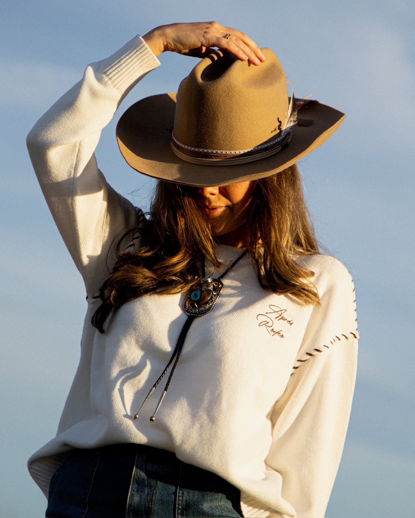 Combing two of our favorite pastimes in the Riley crewneck sweater, “Après Rodeo”, the western trend