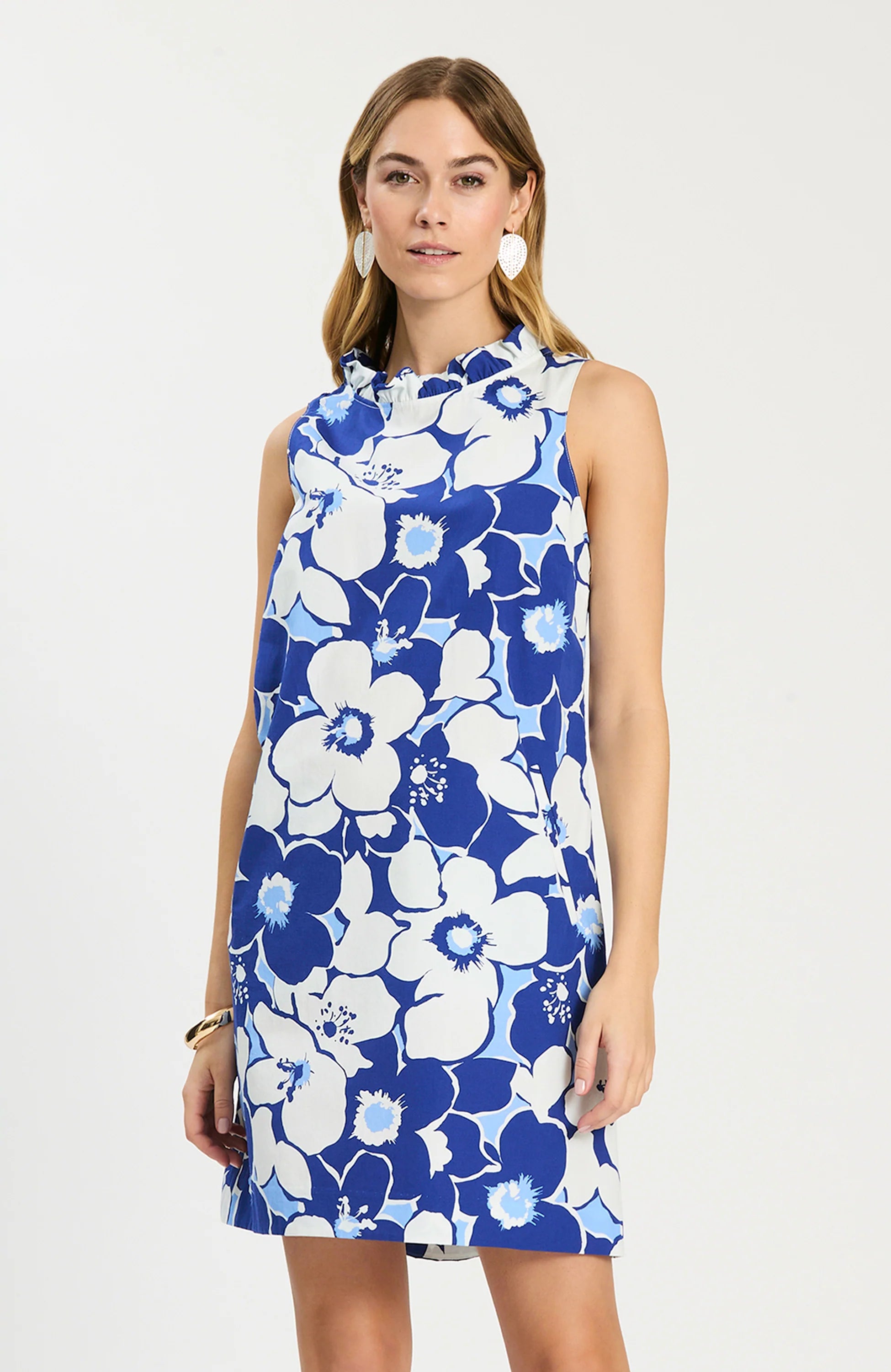 Our best-selling dress is back in a new exclusive print. The Ella Cerulean Floral Ruffle Back Dress is a refined warm-weather favorite with a feminine twist, featuring a bold floral print, soft ruffle detailing along the neckline and back, and polished gold-tone button accents for an elevated finish. Effortless yet sophisticated, it’s perfect for garden parties, summer celebrations, and destination events.