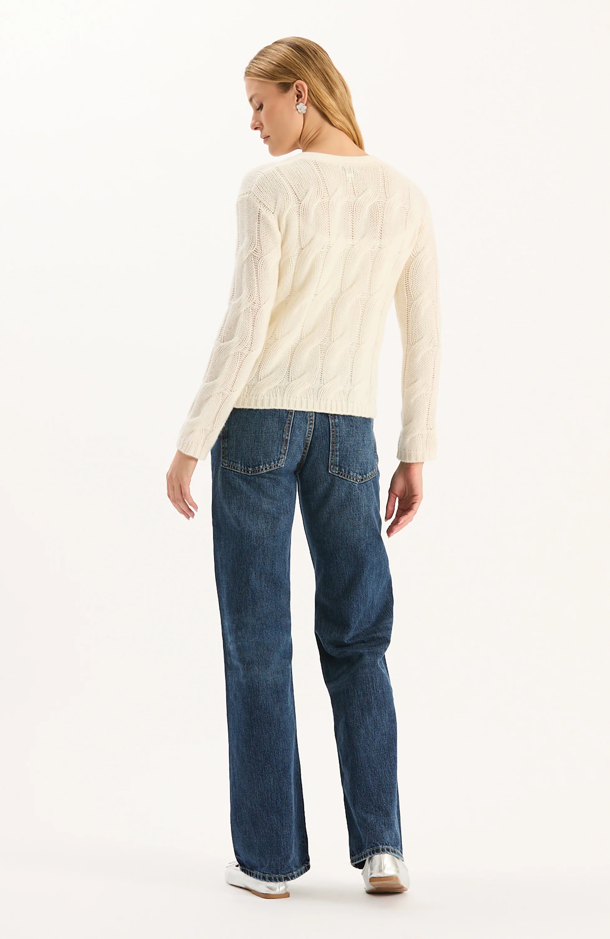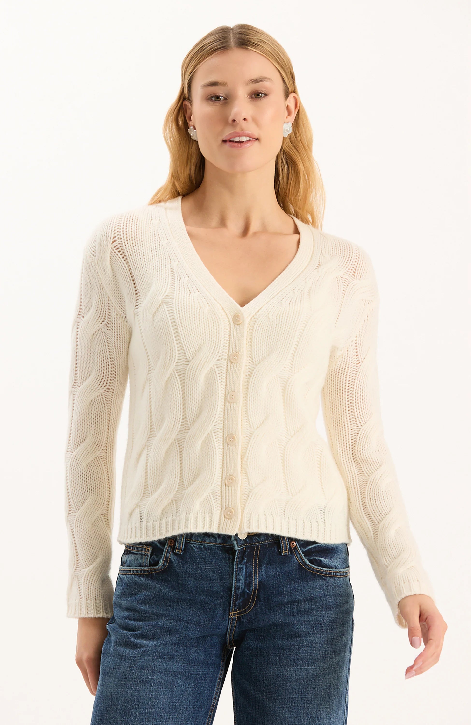 The Cashmere Cable Cardigan is a timeless layering piece that's effortless to wear. Crafted in a soft ivory knit, this cardigan features a classic cable pattern that adds texture and depth. The flattering V-neckline and elegant button-down front bring a refined touch, making it versatile enough for both casual and dressy looks.