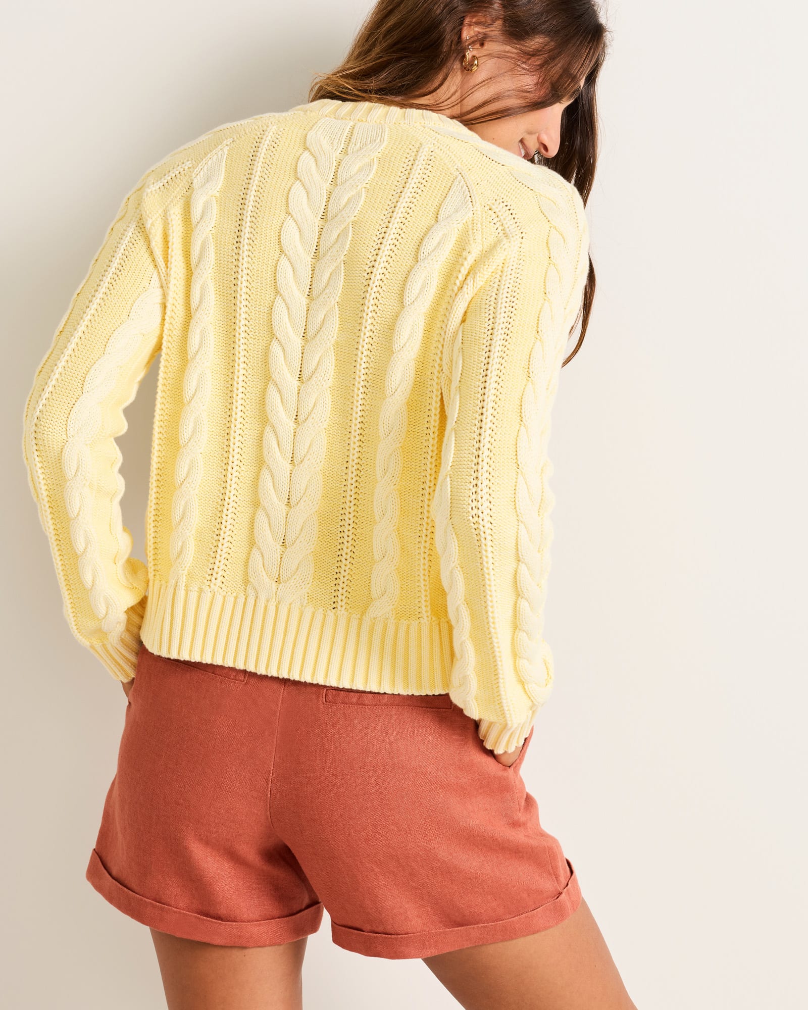 A fresh take on a timeless classic, this cotton cable sweater is crafted in a new silhouette that blends comfort with modern style. The pullover crewneck design showcases intricate cabling across the front, back, and sleeves, adding texture and dimension to a versatile wardrobe essential. Two tonal colored yarns are plaited together for a "sunwashed" appearance. Raglan sleeves offer ease of movement and a flattering fit, while ribbed cuffs and hem ensure lasting shape. Made from breathable 100% cotton, this sweater layers beautifully in any season, pairing effortlessly with jeans, skirts, or tailored pants.