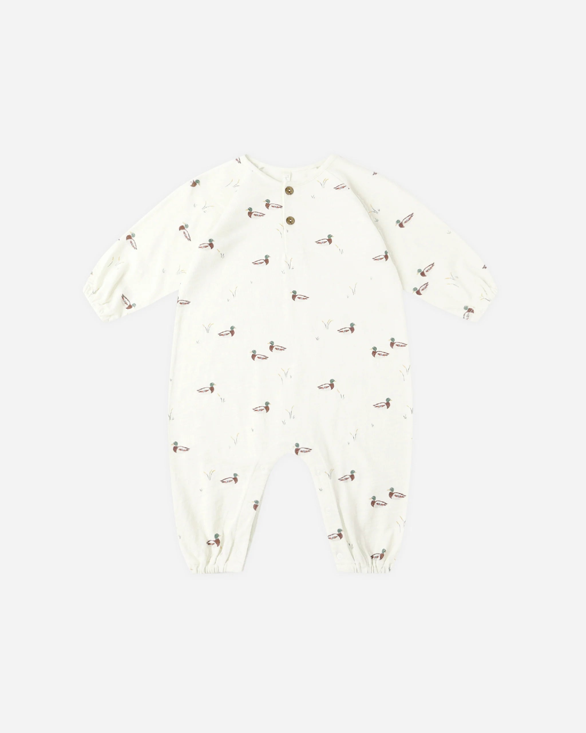 Our Henley Jumpsuit features a bubble silhouette with elasticized wrist and ankle openings, a two-button front placket, and bottom snaps for easy changes.