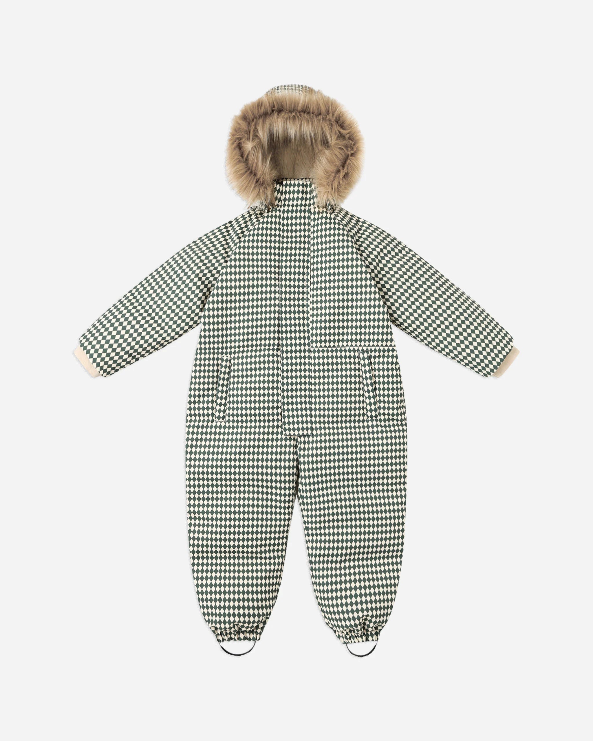 Our Ski Snowsuit will keep your little one cozy and cute on every snow day! Featuring a water-resistant finish, a detachable sherpa-lined hood with faux fur trim, hidden front zipper, warm down-filled padding throughout, front zip pockets, and removable silicone foot straps for a snug, secure fit.
