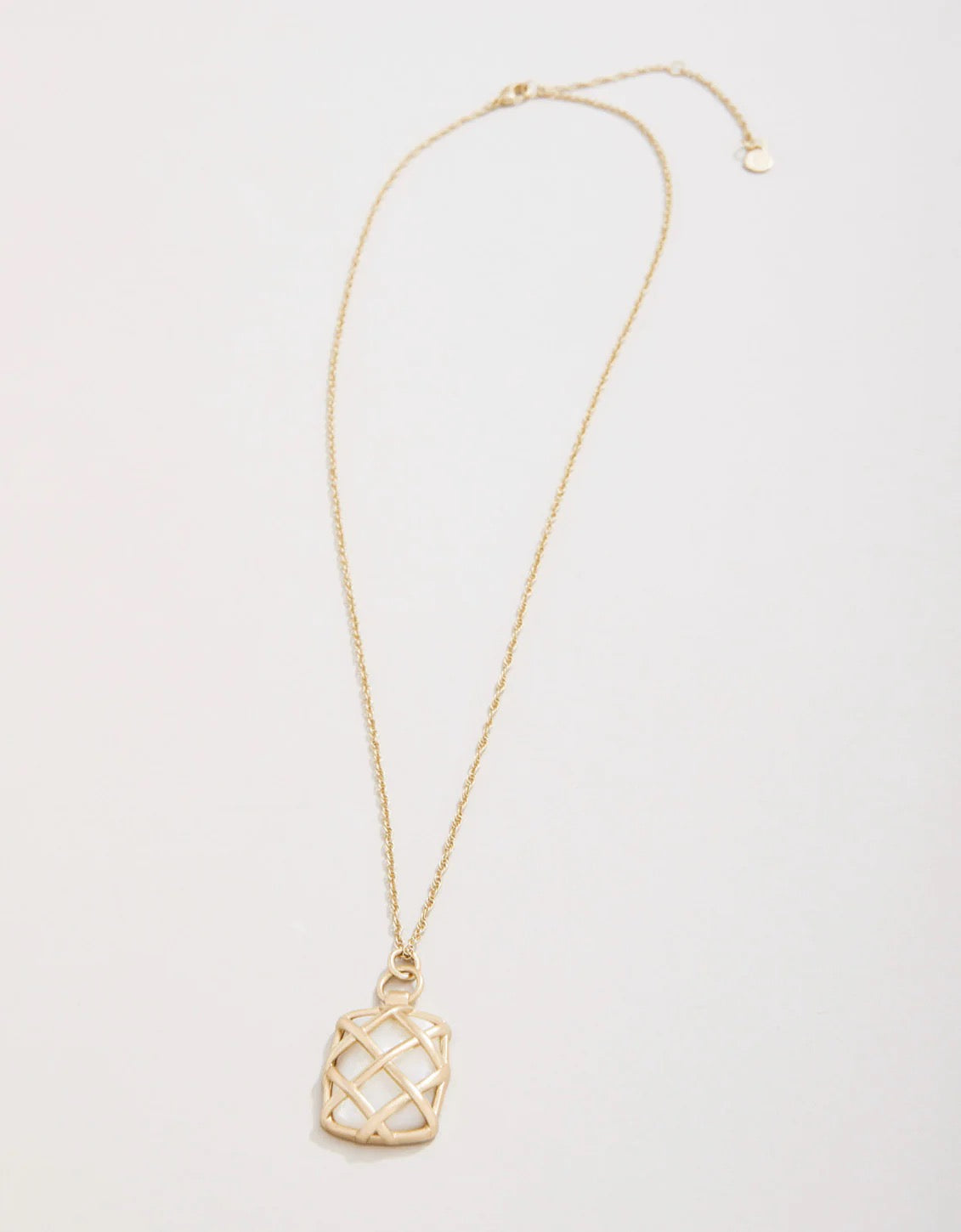 Shimmering Mother-of-pearl glass stone is framed within a woven pattern of 18kt matte gold plating to create our Stonevale Petite Necklace. Subtle charm shines through this must-have accessory.